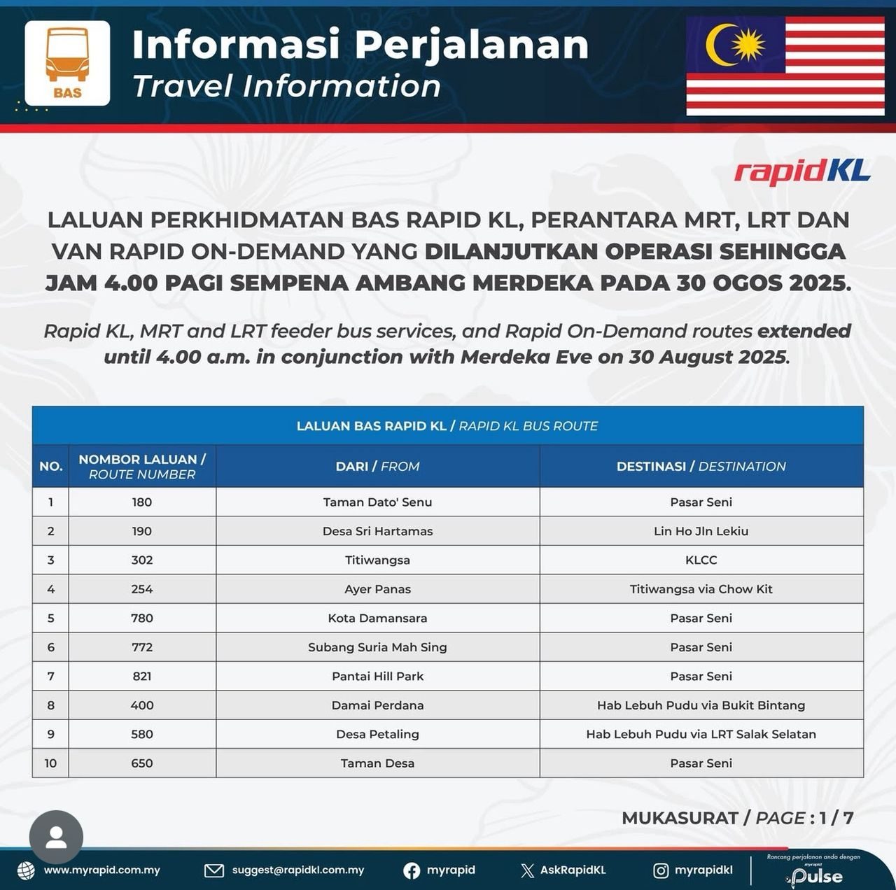 Beberapa laluan perkhidmatan Bas Rapid KL, Perantara MRT/LRT dan Van Rapid KL On-Demand akan melanjutkan operasi sehingga pukul 4.00 pagi sempena Sambutan Ambang Merdeka pada 30 Ogos 2025.