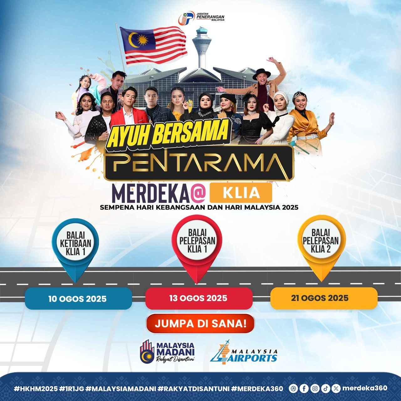 Sambutan Hari Kebangsaan dan Hari Malaysia 2025 dimeriahkan dengan persembahan PENTARAMA Merdeka @KLIA di Balai Pelepasan KLIA 1 pada 13 Ogos 2025, Rabu bermula pukul 2.00 petang hingga 3.30 petang.